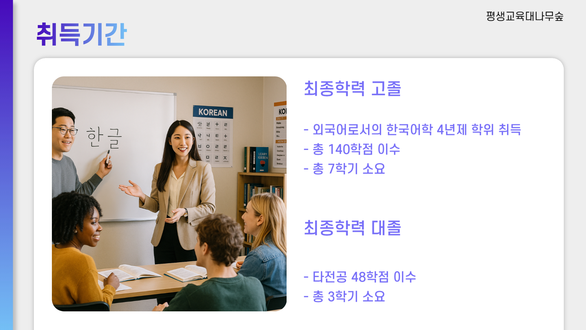 학력은 외국어로서의 한국어학 학사 학위를 보유해야 하며,