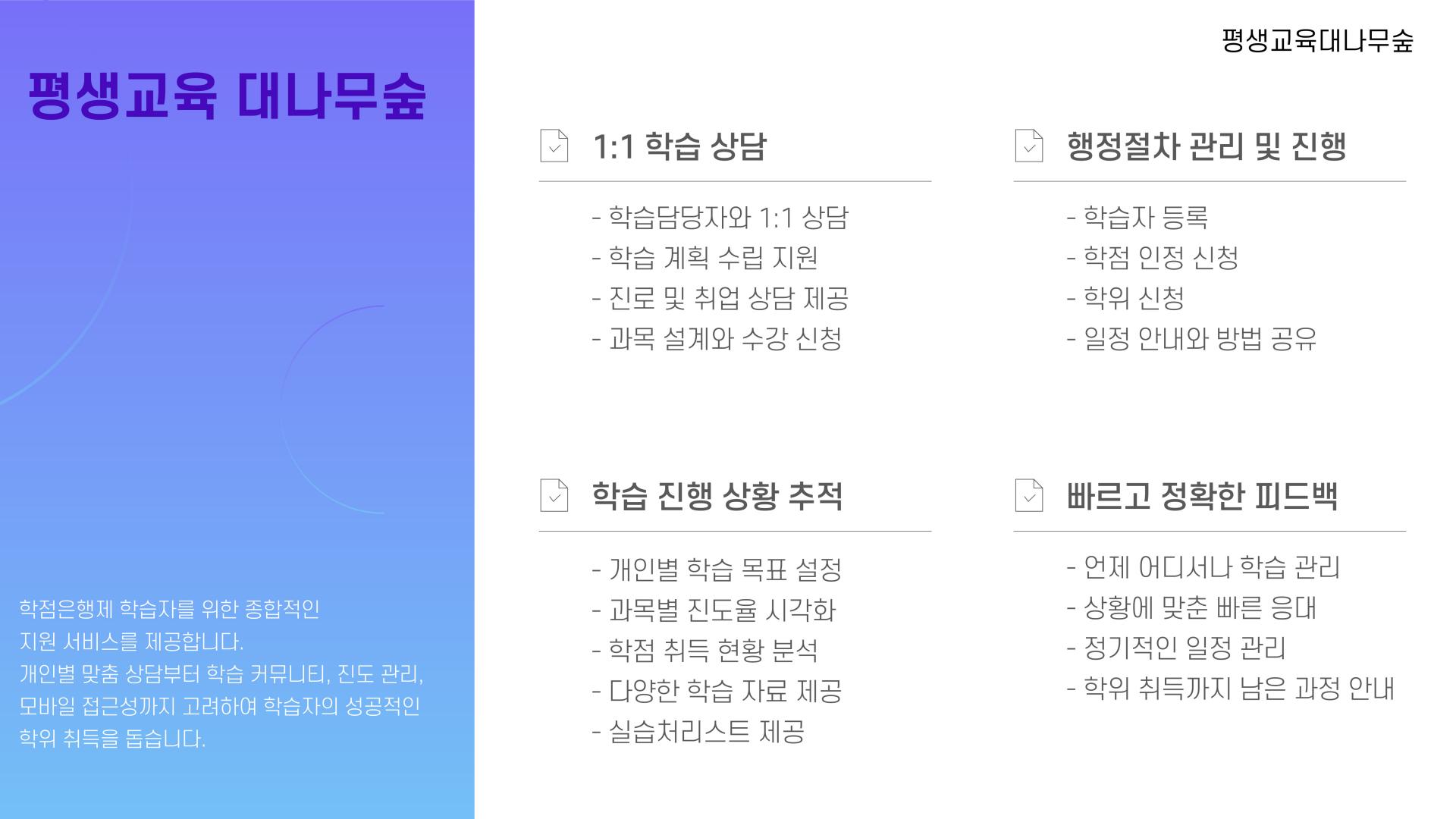 학습자 등록, 학점 인정 신청, 학위 신청 등